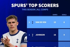 本赛季热刺队内射手榜:中卫范德芬6球居首,约翰逊、帕利尼亚4球
