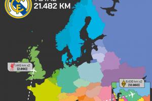 西甲5队欧冠客场往返路程:皇马2.15万公里最远,巴萨1.1万公里