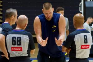在对抗赛结束之后,约基奇拉着三位裁判讨论判罚的具体细节,记者称,约基奇拉着三位裁判问了大约20分钟。