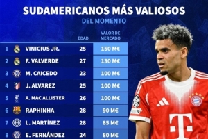 体育资讯10月18日讯 德国转会市场更新了部分球员的身价,并列出南美球员德转身价排名,维尼修斯、巴尔韦德排名前两位。