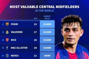 中场中路球员身价排名:佩德里1.4亿欧居首,巴尔韦德、赖斯前三